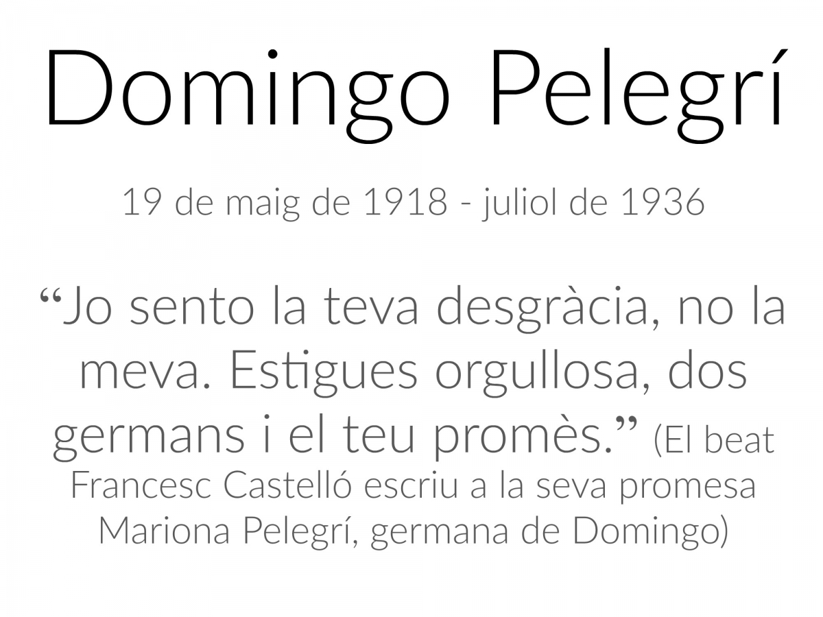 Domingo quería ser farmacéutico. En ese mes de julio de 1936 estaba trabajando en una farmacia cuyo dueño tenía a un sacerdote escondido, vestido convenientemente con una bata blanca para no ser descubierto. Llegaron los milicianos y detuvieron a los tres. Los tirotearon allí mismo, y Domingo cayó muy malherido. Fue trasladado al Hospital Provincial de Lérida y allí, asistido por una monja, murió llevando como siempre su escapulario. Sucedió el 21 de julio de 1936, lo que le convierte en el primero de los fejocistas mártires.